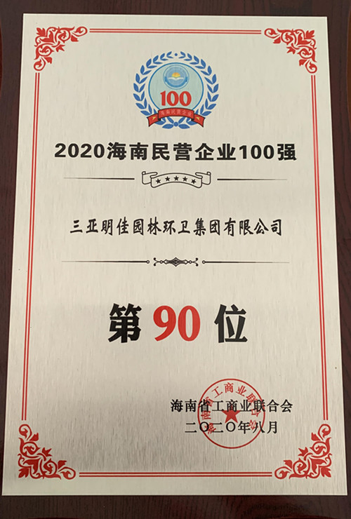 8月28日,“2020海南民營(yíng)企業(yè)百?gòu)?qiáng)發(fā)布會(huì)”在?谂e行。三亞明佳園林環(huán)衛(wèi)集團(tuán)有限公司再次入選“海南民營(yíng)企業(yè)100強(qiáng)”榜單,名列第90位。